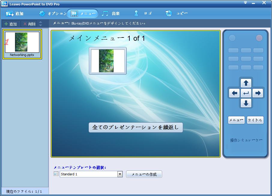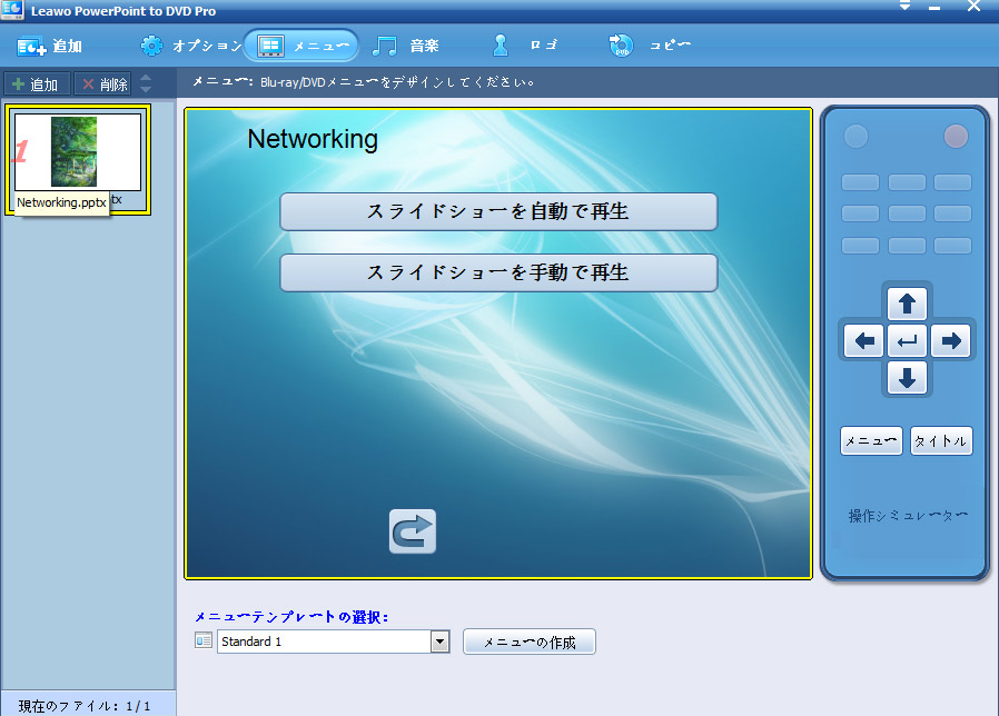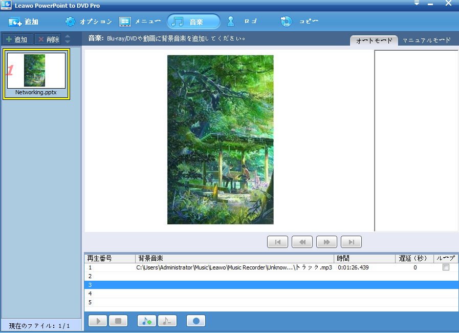 プログラムにソースPowerPointファイルを追加するには、メニュ画面の 「追加」をクリックしてください。 一度は最大にPPTファイルを12枚追加できます。途中でプレビューを持つように1ファイルを選択します。右では、再生オプションが表示されます。