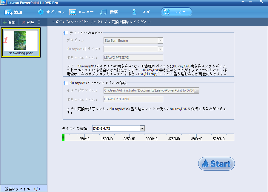 PPTファイルをディスクに書き込むには、まずお使いのPCにブルーレイ/ DVDライターと空白のDVD/Blu-rayディスクが必要です。その後、直接にPPTファイルをDVD/Blu-rayディスクに焼くか、後でディスクに書き込むためのブルーレイ/ DVDイメージファイルを作成するかのどちらでも自由です。設定が完了した後、「スタート」をクリックすれば、DVD/Blu-rayディスクの作成が開始します。