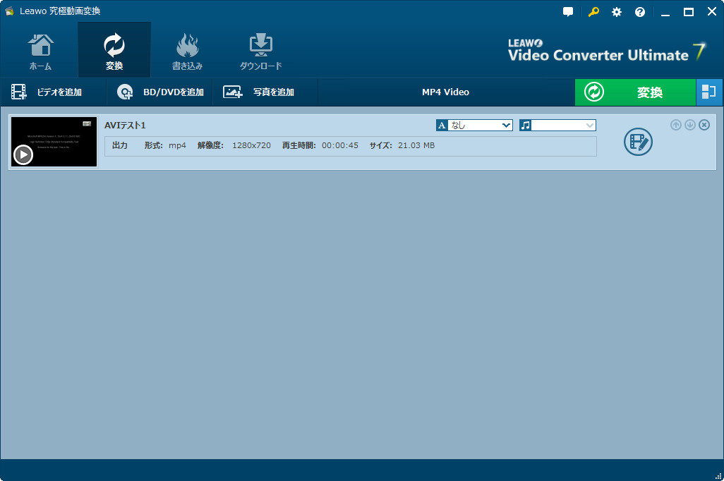 ステップ1. 「Leawo 究極動画変換」を起動、「変換」をクリックします。「ビデオを追加」で動画をロードします。