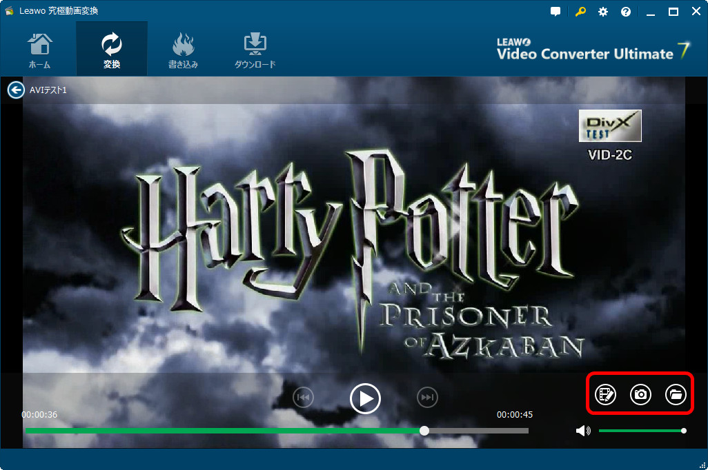 ステップ2. ロードされた動画に「再生」アイコンをクリックして、動画プレビュー画面に入ります。動画プレビュー画面の右下に三つのアイコンがあります。一番左のは「編集」ボタン、真ん中のは「スクリーンショット」ボタン、そして一番右のボタンを押すと、スクリーンショットが保存されているフォルダを開くすることができます。