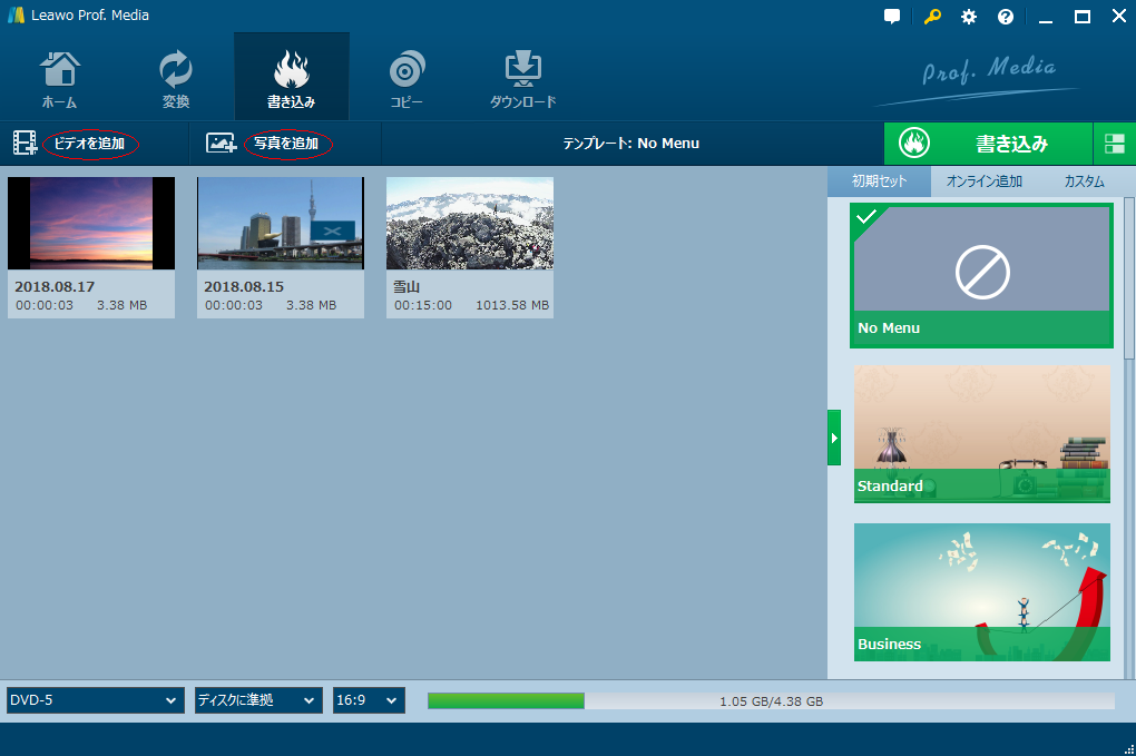 ステップ1.PCもしくはほかの外付けのメモリからBlu-ray作成の画面に写真やビデオを追加します。