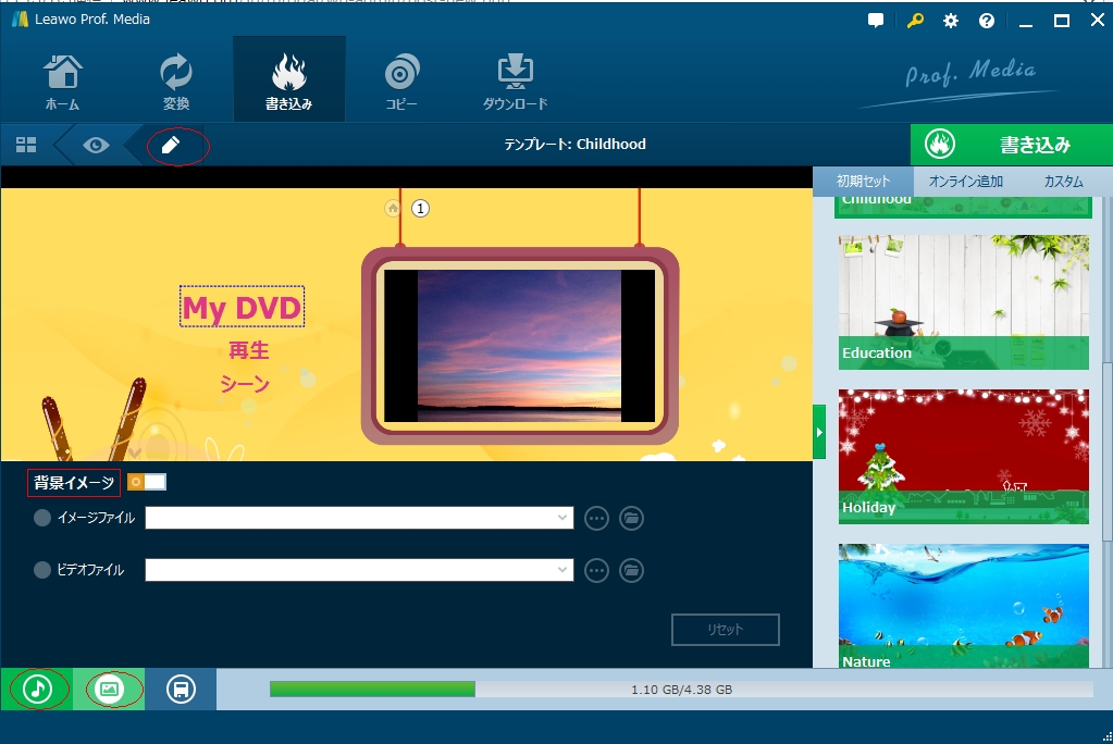 *DVDディスクの編集画面で背景イメージやBGMを自由に変更できます。 例の効果: