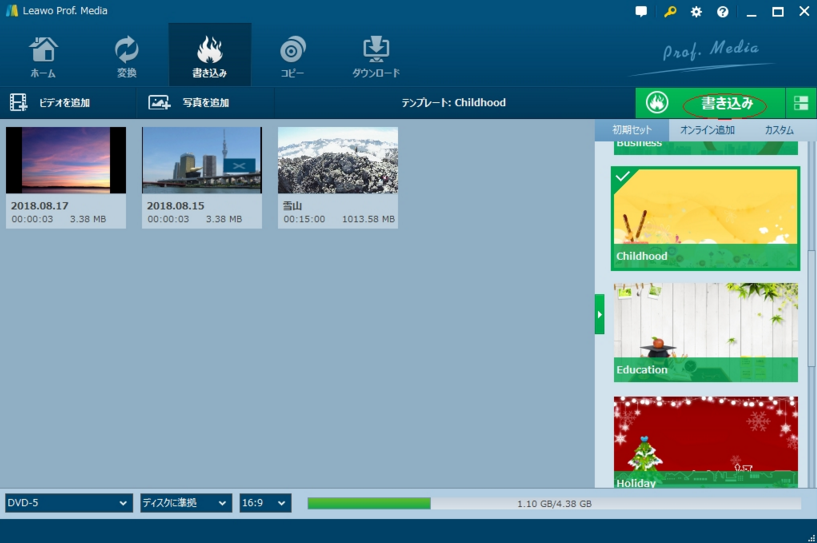 ステップ3.編集完了した後、書き込み用の空のDVDディスクをディスクドライブに挿入して、右上の緑色で囲った「書き込み」ボタンをクリックすれば、DVDへ書き込み開始します。