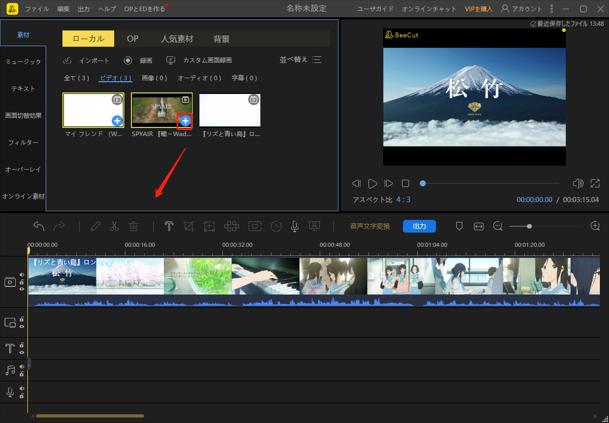 動画ファイルにマウスと置くと「+」が現れます。「+」をクリックして、動画が「ビデオ編集エリア」に表示されます。