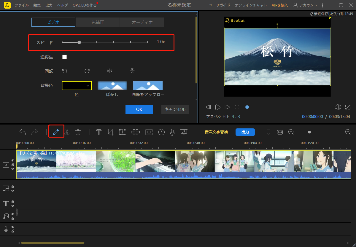 「編集」ボタンをクリックして、ビデオ/オーディオ編集パネルに入ります。スピード調整バーでスライドを右に移動することで動画の再生速度を変更します。