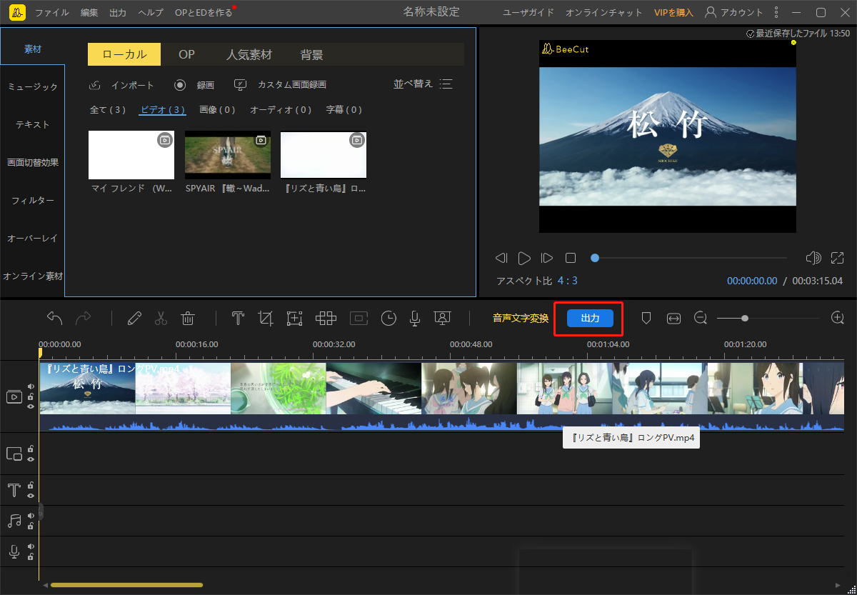 「ok」をクリックして、設定を保存します。そして、青い「出力」ボタンをクリックして、編集した動画をパソコンに保存します。