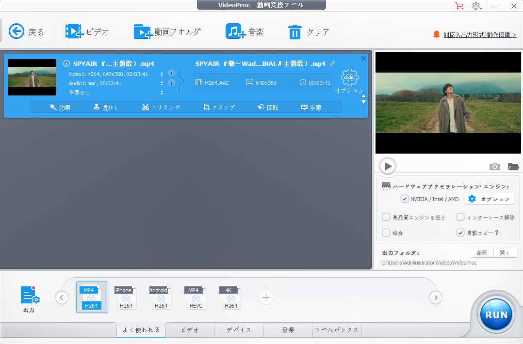 VideoProcはWindows/Mac用多機能の動画処理ソフトです。動画を簡単に編集・変換できるだけでなく、DVDをリッピング、動画をダウンロード、更にスクリーン録画をすることができます。VideoProcを使えば、簡単に動画の再生速度を変更可能です。VideoProcは専門的な動画編集・動画加工ソフトではないので、簡単な動画編集をしたい初心者に向いています。熟練者は、プロ向けのAdobe Premiere Pro、VideoStudio、Shotcut、AviUtlなどの動画編集ソフトを利用してください。
