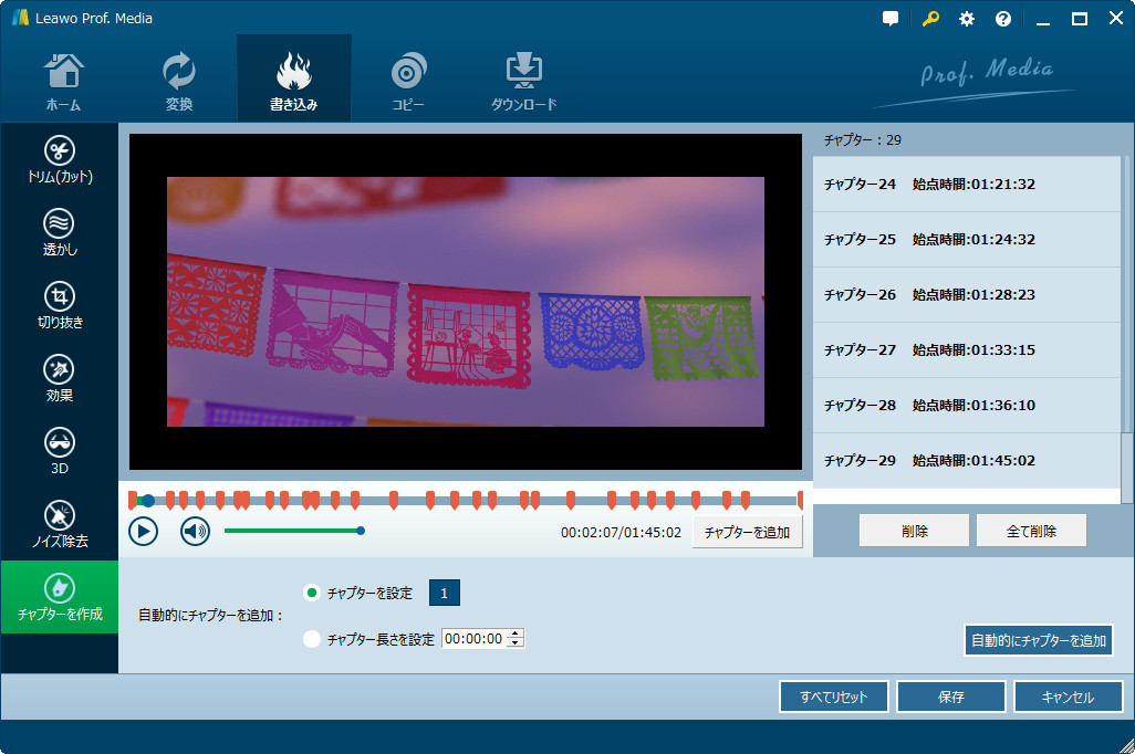 ディスク オーサリングソフトについて、こちらはLeawo Blu-ray作成をおすすめします。Leawo Blu-ray作成は180種類以上のビデオ、オーディオファイルをブルーレイディスク、DVDに書き込むことができます。ディスクだけでなく、ISOファイル、フォルダに作成することもできます。動画をディスクに焼く前に、動画編集機能で、透かし追加、3D映像に変換、映像カットなどを行うことができます。内蔵の再生プレーヤーによって、プレビューも可能です。