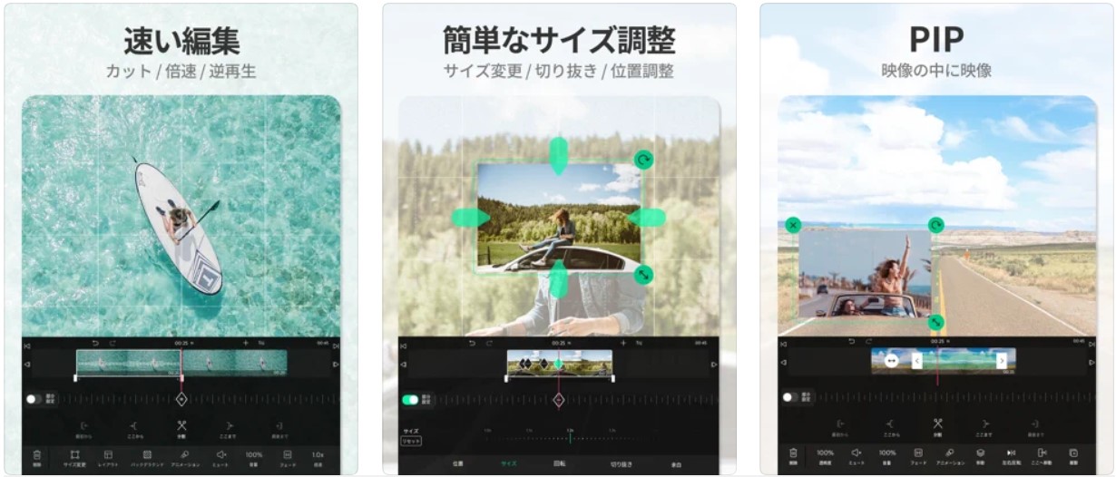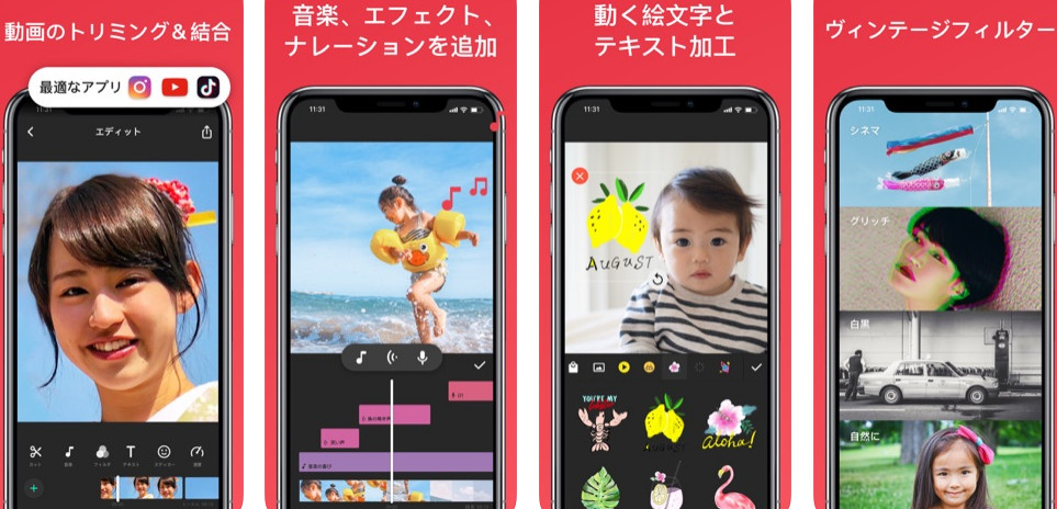 InShotは、Instagram 向けで、Instagramの動画編集に最適な動画加工アプリです。SNSとの連携に特化しました。Instagramでの表示に適した正方形のトリミング/編集がカンタンに行えるほか、テキストや絵文字、BGMの挿入といった編集も、もちろん可能。動画のプラットフォームとしてInstagramを使いたい場合にオススメです。一番優れた点は使いやすくて、誰でも操作できるということです。 inShotは、iPhone・Android端末ともに使用できます。