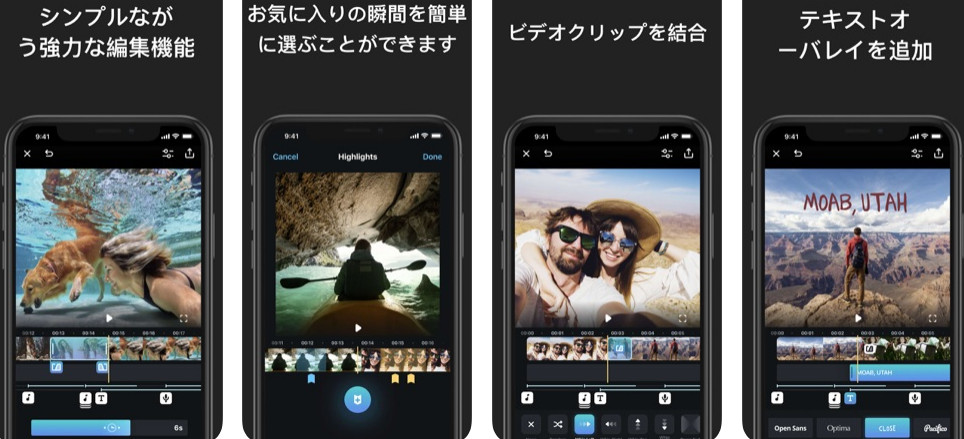 GoProからリリースされているアプリです。 Spliceには、ワイプやスロー再生などの特殊効果や、無料で使用できるBGM、BGMの長さや音量の調節機能などの機能が備わっており、撮影した動画を細かく編集して仕上げたい方に向きのアプリとなっています。 Spliceは、iPhoneでのみ使用可能な動画編集アプリです。