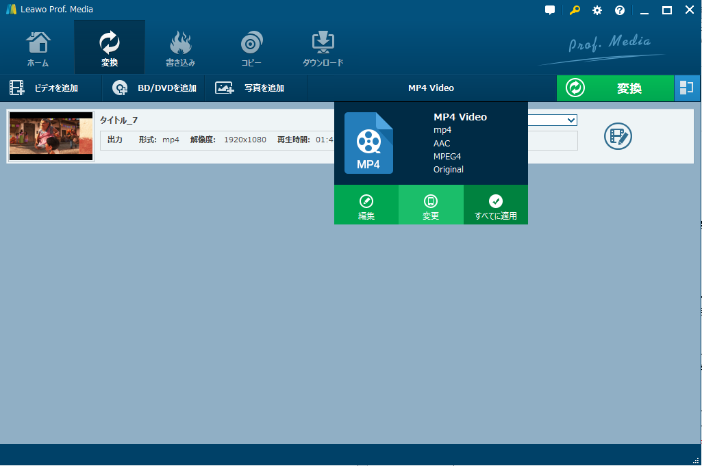 ステップ3.「MP4 Video」のタブで「変更」をクリックして、出力形式の設定画面に入ります。「4K Video」のタブをクリックして、4K MP4 Videoの出力形式を選びます。