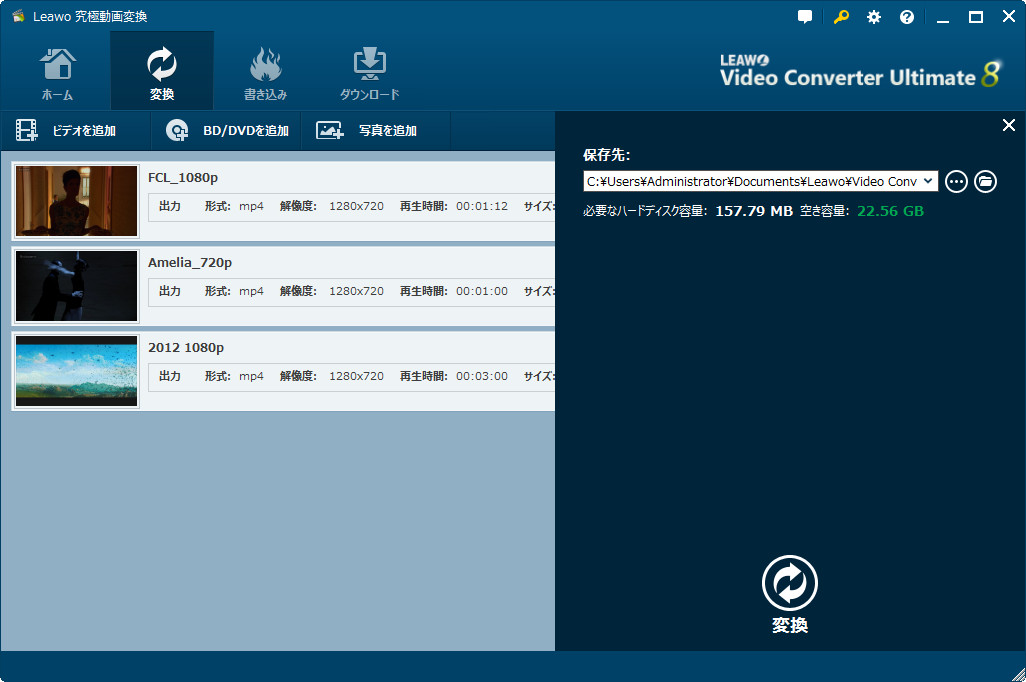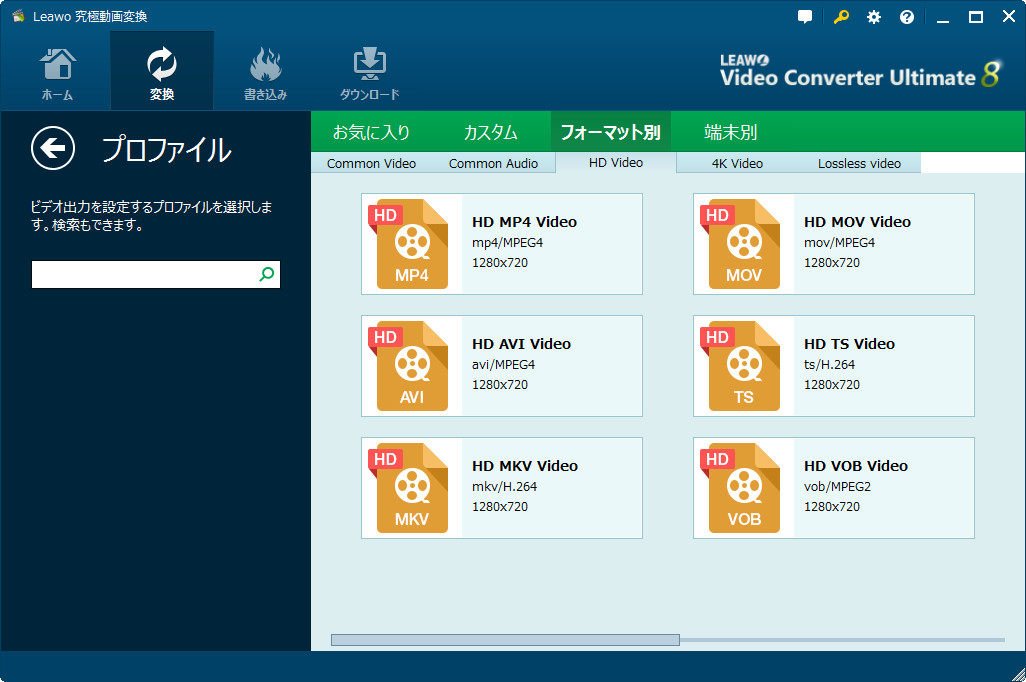 Leawo 究極動画はBlu-ray変換、Blu-ray作成、DVD変換、DVD作成、HD動画変換、オンライン動画ダウンロード、写真スライドショー作成などの機能を持つ究極メディア変換ソフトです。 今すぐ1080P動画を720Pに変換する方法を説明します。