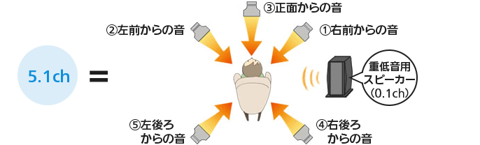 サラウンドのチャンネル数は通常「5.1ch」「7.1ch」などと記述されます。音が発する位置(聞こえてくる方向、場所)を「チャンネル」、「ch」で表記します。この「チャンネル」の数が多いほど、サラウンド効果はより臨場感にあふれたリアルなものになります。