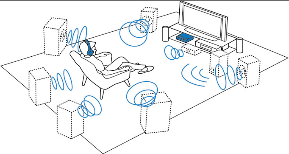 サラウンドとは、音声の記録再生方法のひとつです。視聴者のまわりをスピーカーが取り囲むように配置することによって、音に包まれるような立体的な音響効果を得るので、サラウンド音声と言います。