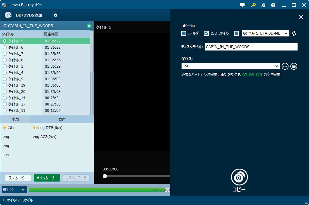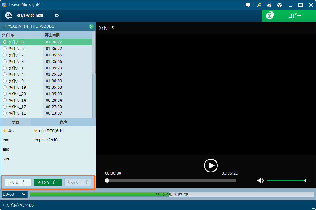 「フルムービー」「メインムービー」「カスタムモード」三つのコピーモードがあります。 Blu-rayをそのままにPCにコピーする時に、「カスタムモード」に対応できないということをご注意ください。「フルムービー」「メインムービー」を選択できます。 「フルムービー」は全てのタイトルをそのままにコピーします。 「メインムービー」は自動的に最も長いタイトルを選んでコピーします。