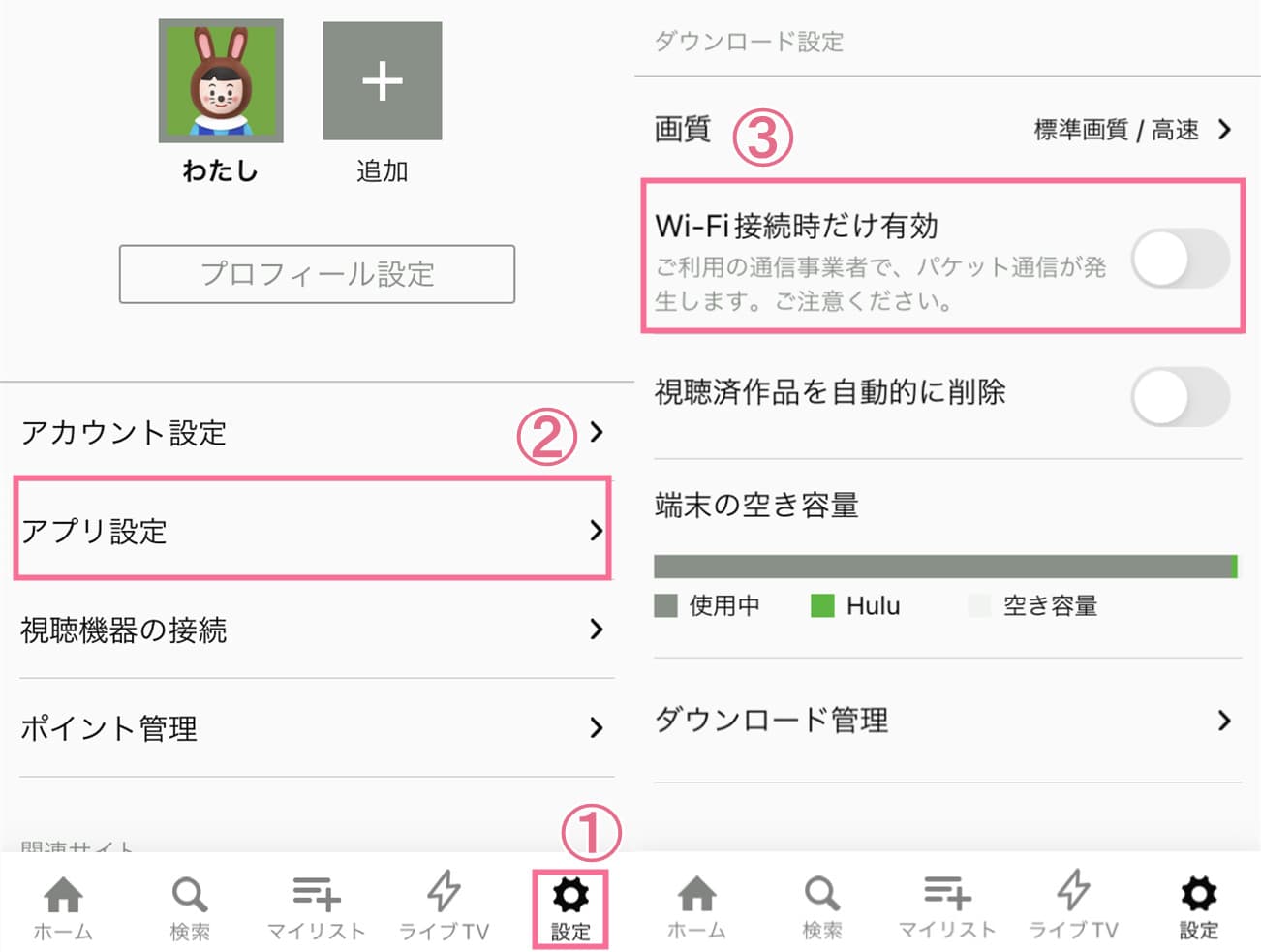 Huluアプリはデフォルトでは、「Wi-Fi接続時にのみ作品がダウンロードできる」という設定になっています。モバイルネットワークを利用してダウンロードしたい場合は、別途設定が必要になります。