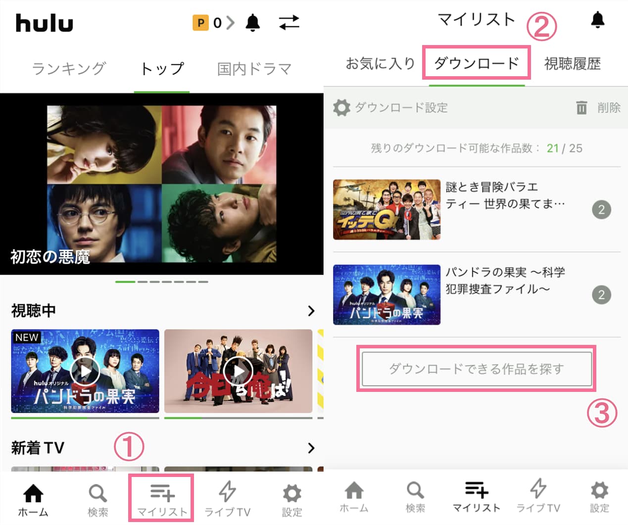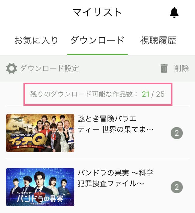 Huluでは1アカウントにつき最大25本までの作品しかダウンロードできないという制限があります。もしダウンロードできる上限数の25本を超えてしまえば、ダウンロードができなくなります。
