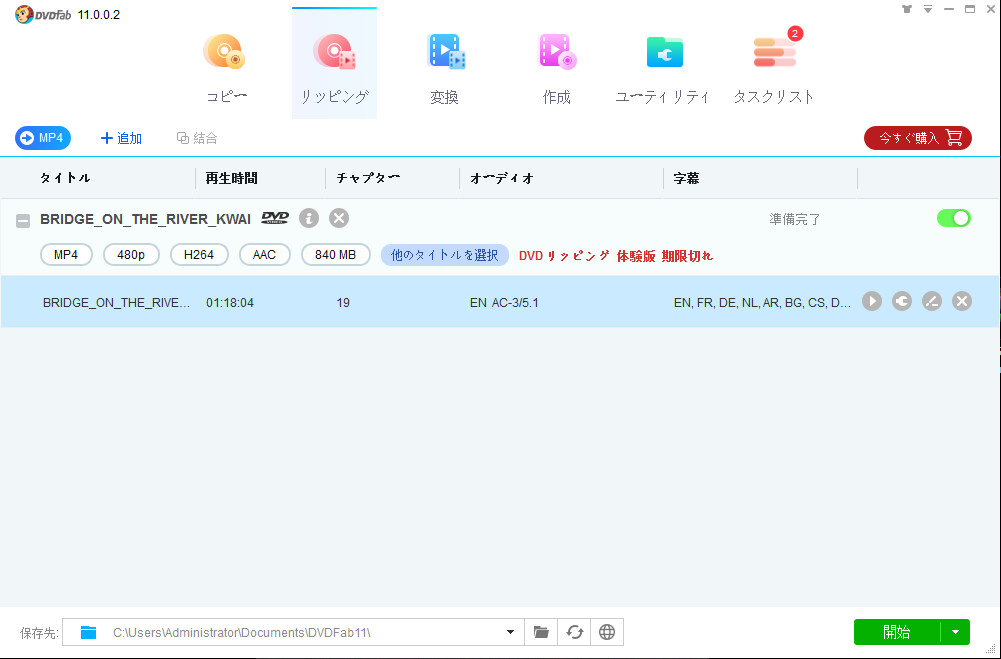 最後はソフトの右下隅にある「開始」ボタンをクリックすると、DVDの変換が開始します。