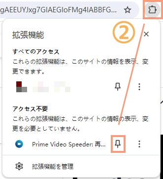 • 右上にあるパズルのアイコン(拡張機能ボタン)をクリックし、一覧からPrime Video Speederを見つけます。