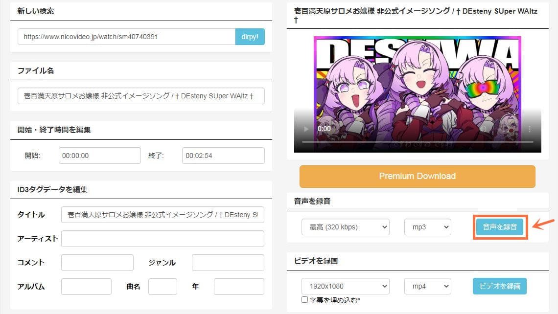 Dirpyでニコニコ動画をMP3に変換ダウンロードする手順: