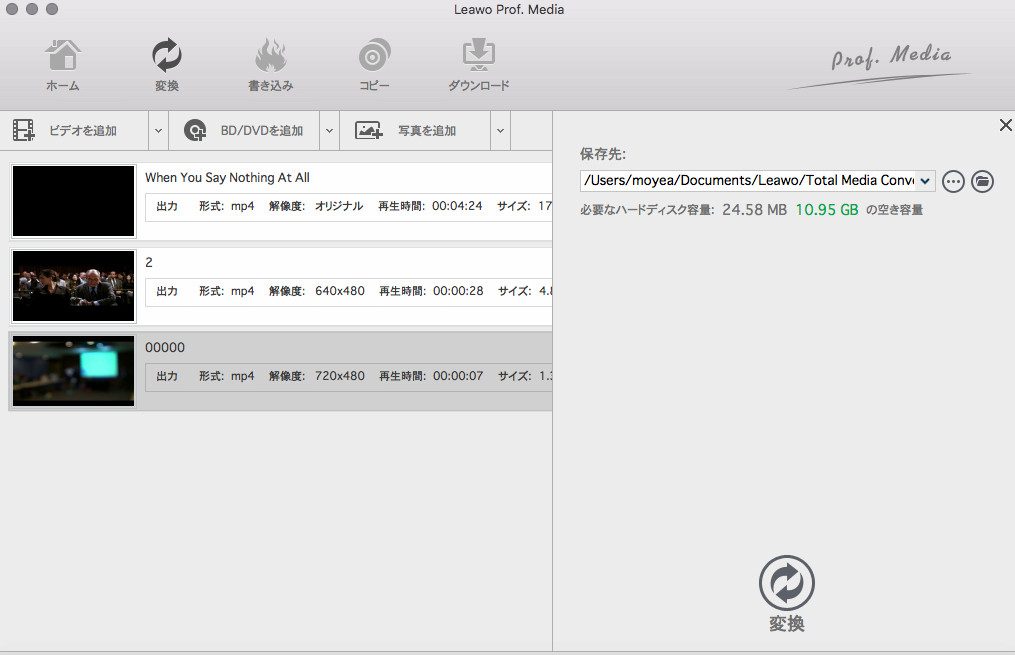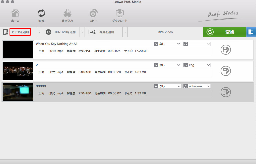 Leawo動画変換プロ for Mac」を起動、「動画変換」モジュールを開いて、「ビデオを追加」ボタンをクリックすれば、フォルダを参照して変換したいVOBビデオを追加できます。
