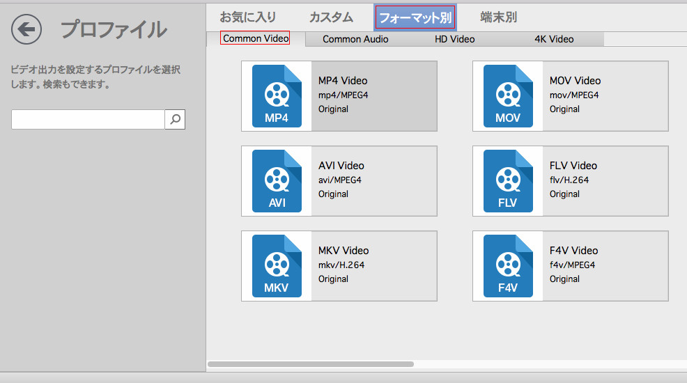 「フォーマット>Common Video」タブを開いて、MPEG-1, MPEG-2または MPEG-4を選択してください。あるいは、左側のプロフィール検索バーにmpegを入力して、変換したい出力形式を検索します。