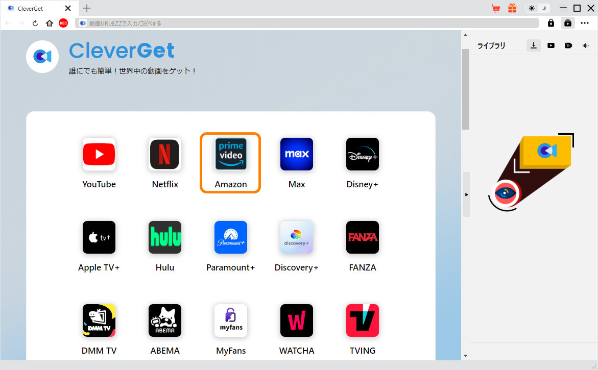・手順2: CleverGetのメイン画面にある「Amazon」アイコンをクリックし、Amazonプライムビデオの公式サイトを開きます。