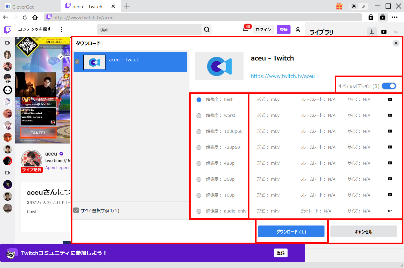 Twitchの生配信動画をダウンロードする最も効率的な方法は、専門のダウンロードソフト「CleverGet Twitch動画ダウンロード」を利用することです。このソフトは、Twitchの生配信、アーカイブ動画、クリップのすべてをダウンロードできる強力なツールとして、多くの配信者や視聴者に利用されています。