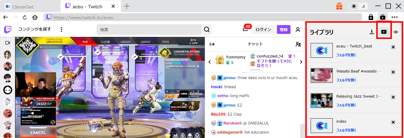 2. Twitchからダウンロードしたい配信動画を開きます。生配信の再生が開始されると、CleverGetが自動的に動画を解析し、ダウンロード可能なオプションを検出します。解析には数秒から十数秒程度かかる場合があります。