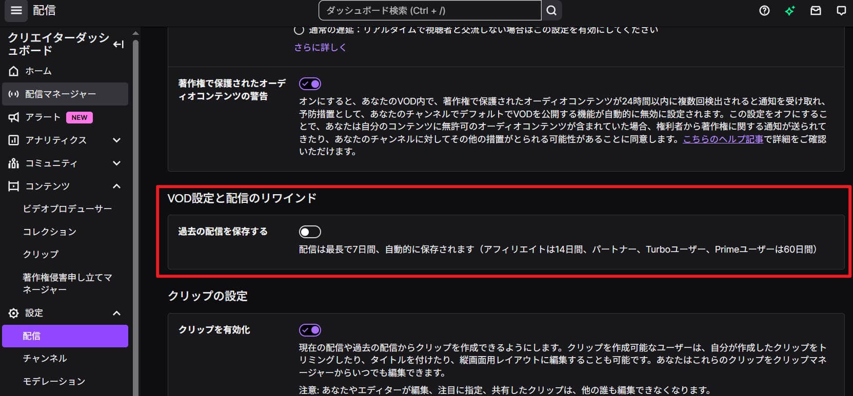 2. 配信設定ページが表示されたら、「VOD設定と配信のリワインド」セクションを探します。ここに「過去の配信を保存する」をオンに切り替え、有効にします。そうすると、今後の配信が終了した後、自動的にTwitchのサーバーに保存されるようになります。この設定がオフのままだと、どれだけ素晴らしい配信をしても記録は一切残りません。
