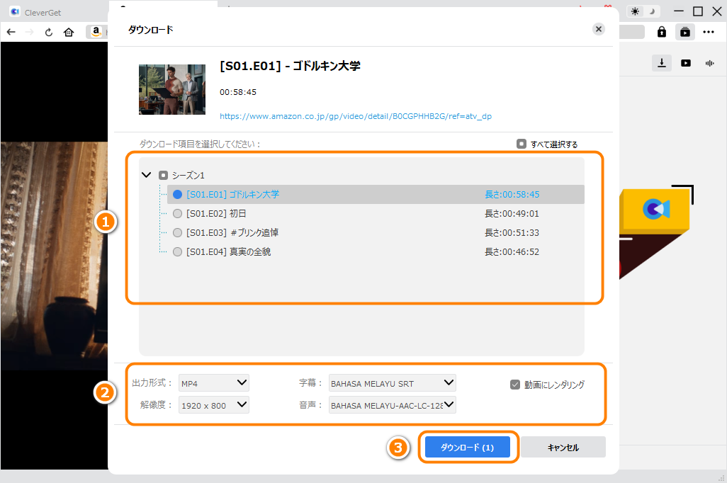 CleverGet Amazon動画ダウンロードでダウンロードする際、お気に入りの字幕や音声を選択してダウンロードできます。