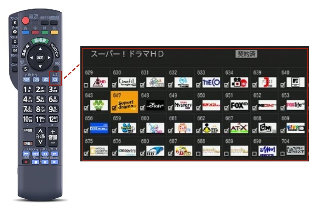 2. リモコンの「CS」ボタンを押して、スカパー!のチャンネルを選択します。