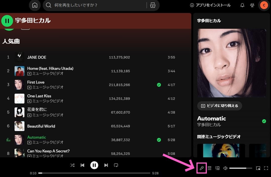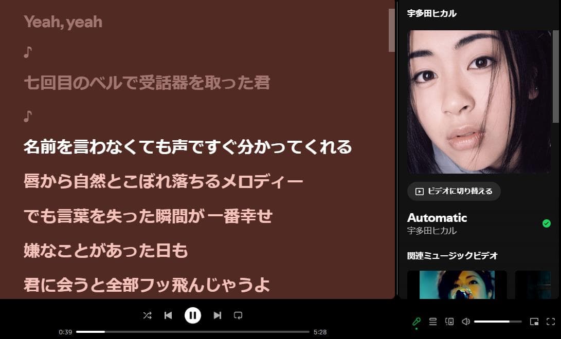 また、Spotifyには「歌詞プレビュー」という新しい機能があり、これにより再生画面に曲の進行に合わせて歌詞の一部が表示されます。