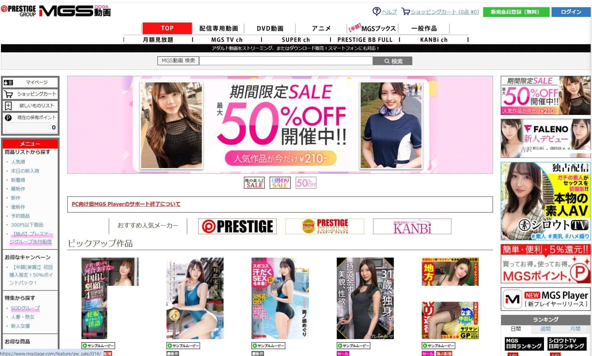 MGS動画ではアダルトタイトル約13万本を配信しています。人気AV女優、素人、アニメ、VR作品など、品揃えが充実しています。プレステージ、SODクリエイト、黒船、しろうとまんまん、MOON FORCE、KANBi、DOCなどのAVメーカーの作品以外、シロウトTV、プレステージプレミアム、ナンパTV、Jacksonなどの独占AVメーカーの作品もあります。MGS動画の会員登録は無料で、ユーザーは、作品単体をレンタルまたは購入して視聴する以外、月額固定料金を支払うことでチャネル内の動画を見放題することもできます。MGS動画は、期間限定セール、日替わりセール、ポイントバックなど、お得なキャンペーンをたびたび開催しています。例えば、MGSプレステージ動画は、年末年始やバレンタインに100円で見れるエロ動画キャンペーンを実施し、人気を博しています。