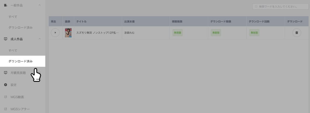 5. ダウンロードが完了したら、左側のメニューから「ダウンロード済み」を選びます。ここでダウンロードした商品一覧が表示され、その中から特定の商品を探すことができます。ダウンロードした動画は再生ボタンを押せばいつでも視聴できます。