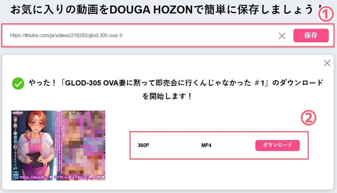 「DOUGA HOZON」は、さまざまな動画共有サイトから動画を簡単にダウンロードできるオンラインツールです。TKTubeのほか、YouTubeやInstagram、MissAV、Pornhubなど、幅広いサイトに対応しています。動画のリンクを貼り付けるだけで自動的に解析され、MP4形式で保存することができます。