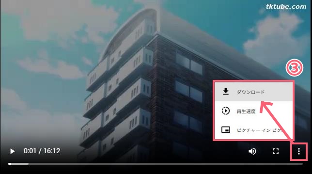 4. 再生画面右下にある縦三点リーダー(︙)をクリックし、「ダウンロード」を選択すると、動画が保存されます。
