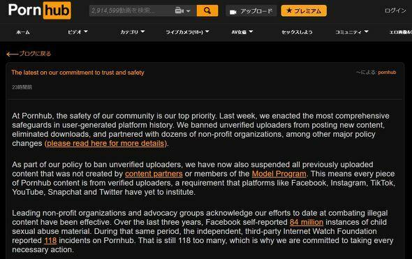 これに対して、Pornhubは12月9日にポリシーを変更しました。未認証ユーザーがアップロードしたコンテンツを全部削除し、動画のダウンロードを禁止し、不適切な内容に対する監視を強化することと発表しました。