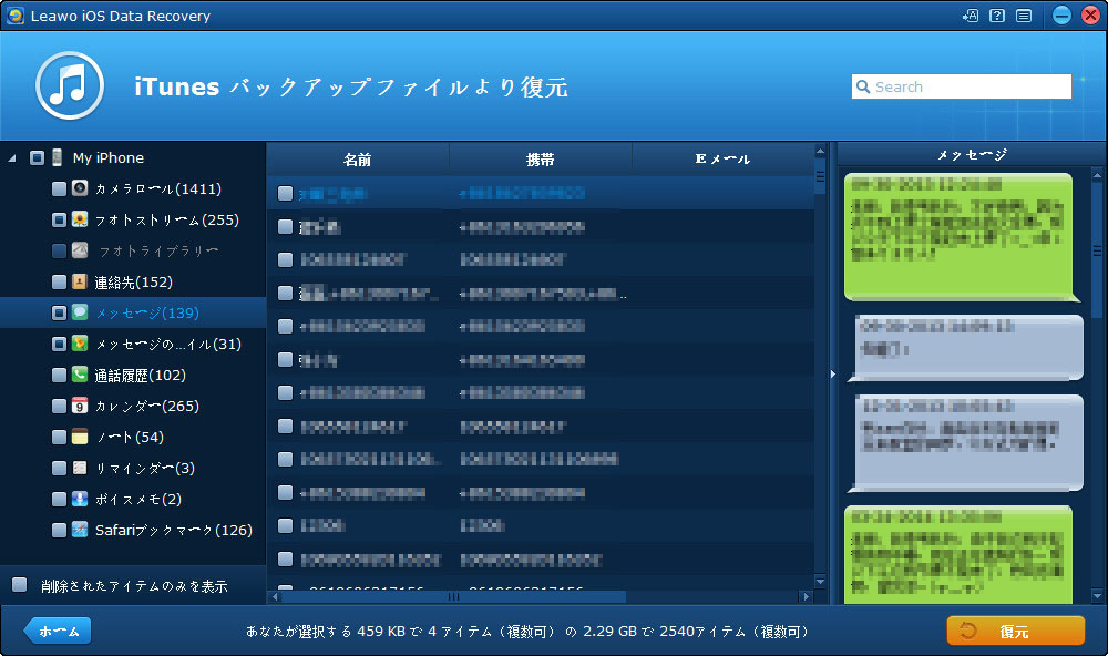 ■左側スライドバーの「メッセージ」、「メッセージの添付ファイル」項目を選択してから、右側のプレビュー画面に復元したいファイルにチェックを入れて、[復元]ボタンをクリックするだけです。 メッセージはもちろん、写真や音楽、カレンダーやSafariのブックマークなどあらゆるデータを復元することができます。