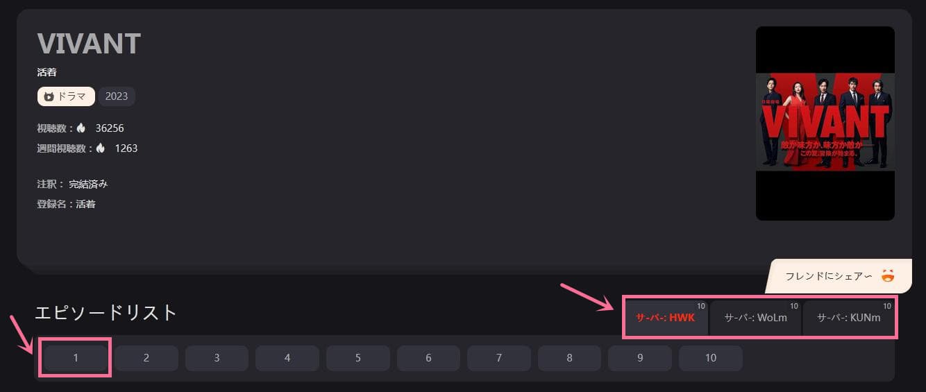 動画が見れない場合、まずは再生画面の右側でサーバーを切り替えてから、もう一度再生してみてください。