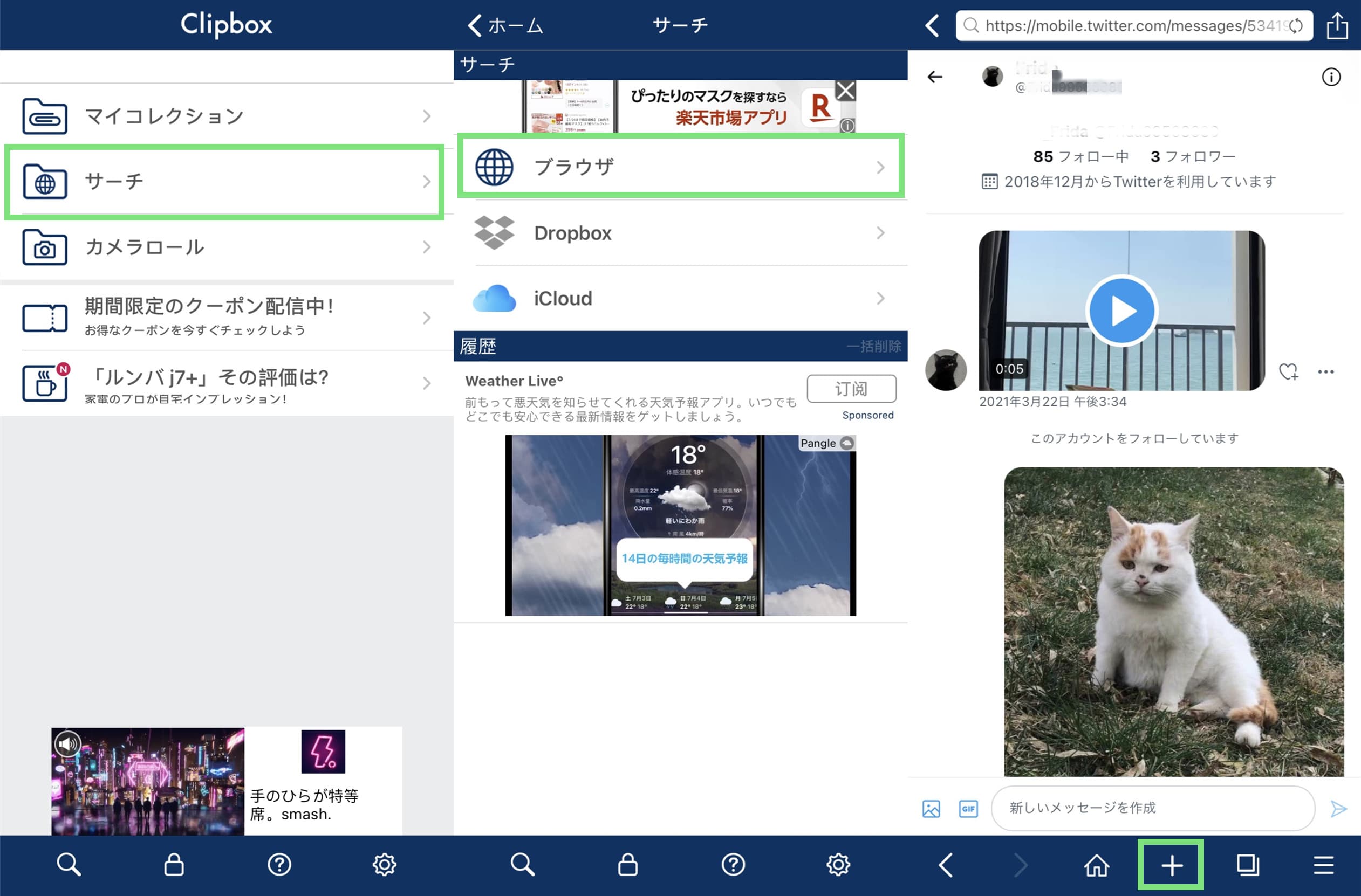 ClipBox+は、Web検索、ブックマーク、ファイル管理、動画/音楽ダウンロードなどができる無料多機能アプリで、iPhone/Androidスマホで無料で利用可能です。アプリ内のブラウザを利用してTwitterに登録すれば簡単にDMの動画を保存できます。