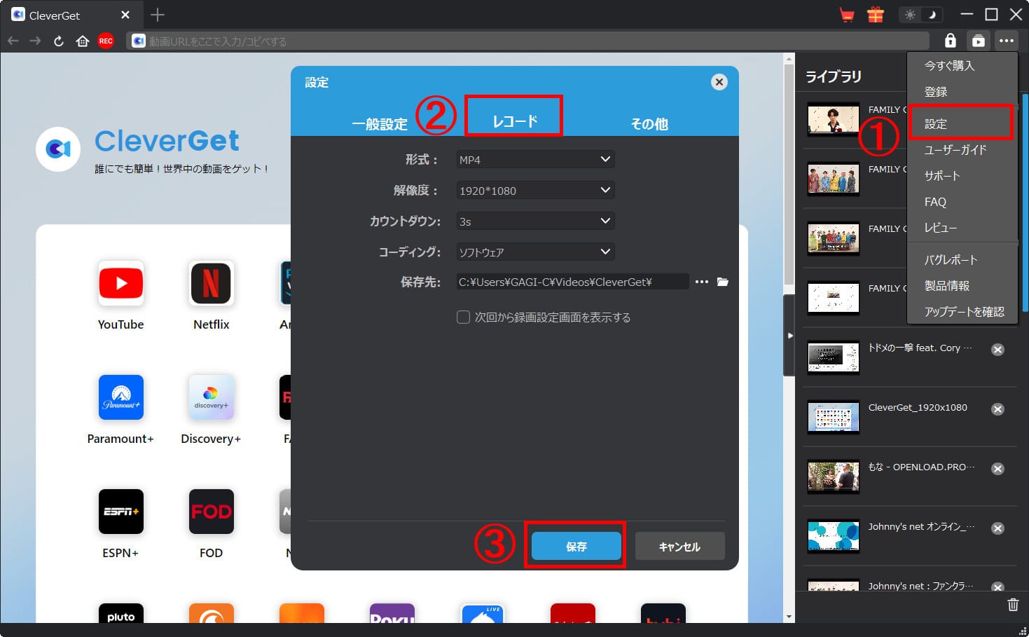 ステップ1.CleverGetを立ち上げます。次に、右上の設定ボタンをクリックして、「レコード」画面で動画の出力形式や画質を設定します。