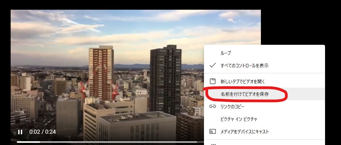 新しいタブで動画のURLを開きます。動画を右クリックして、「名前を付けて動画を保存」をクリックすれだけで、動画をPCにダウンロードできます。