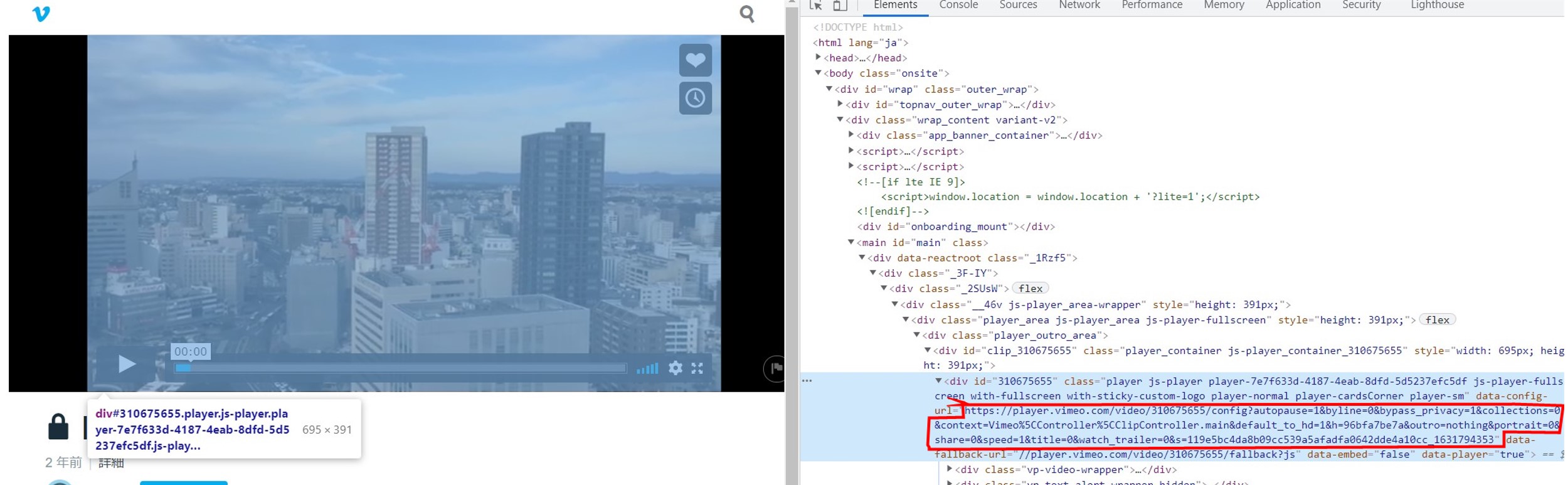 マウスが正しい位置に置かれたとき、青いフレームが動画を包みます。これによって、data-config-url=後のURLをコピーします。
