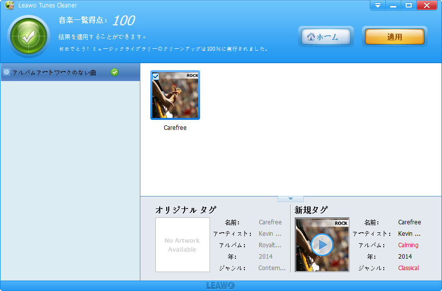 内蔵するユニークなスコアシステムでは、自動的に音楽ライブラリの状態の得点をスコアすることができます。Leawo Tunes Cleanerでクリーンアップ管理するとiTunesライブラリを100点満点を取られるよ。