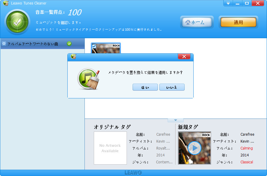 Leawo Tunes CleanerはスマートにiTunesをクリーンアップすることができる素敵なiTunesパートナーです。プロなiTunes音楽ファイル管理プログラムとして、Leawo Tunes Cleanerは重複した曲を検出して一括に削除、iTunes音楽ファイルのアルバムアートワークを取得、アルバム、タイトル、アーティストなどの音楽タグをダウンロード保存。