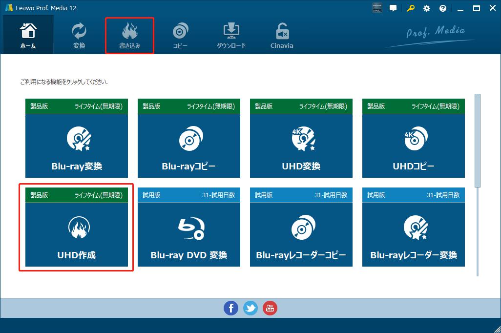 Leawo Prof. Media 13を起動して、ホーム画面にある「UHD作成」タブをクリックすると、ディスク作成の画面に入ります。または上の機能モジュールにある「書き込み」アイコンをクリックします。