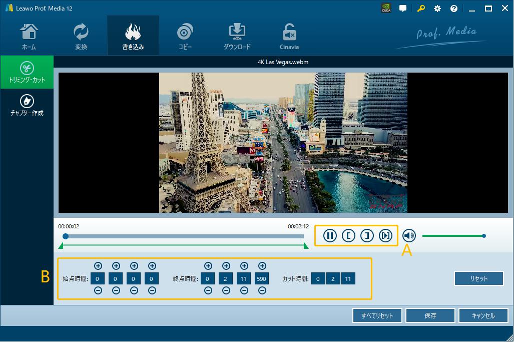 カット時間:セットしたトリム範囲の再生時間です。直接に入力して時間を指定することができます。