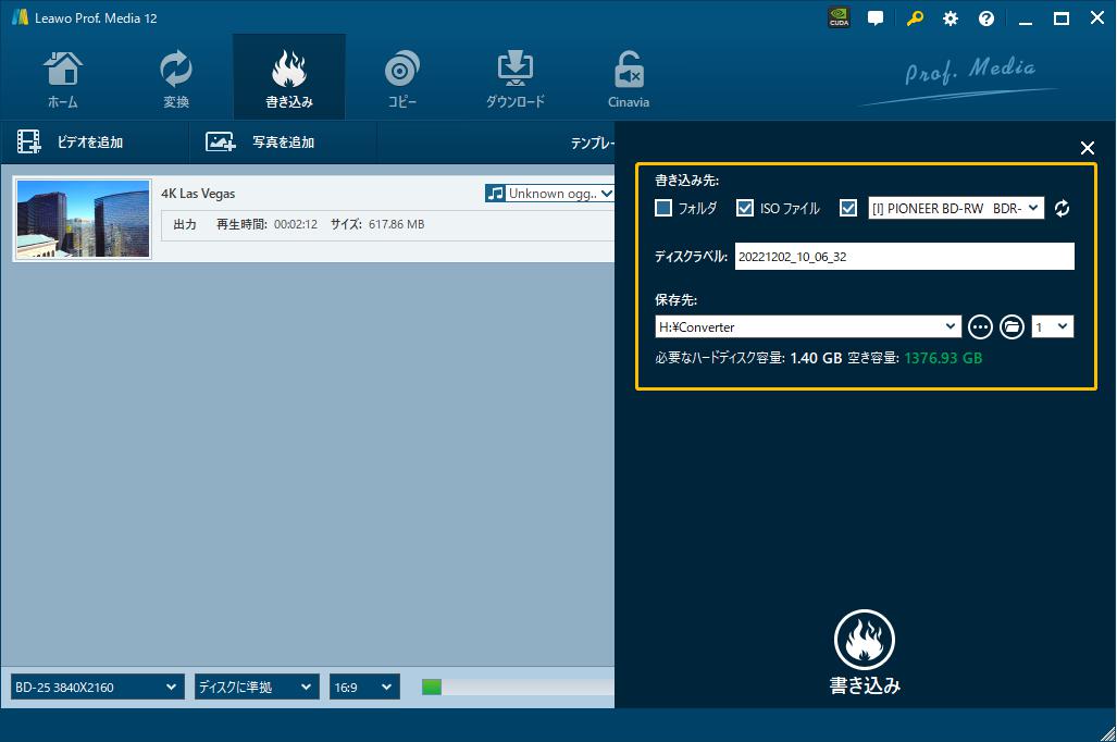 右上の緑「書き込み」ボタンをクリックすると、4Kブルーレイディスクの書き込み出力設定パネルが出ています。