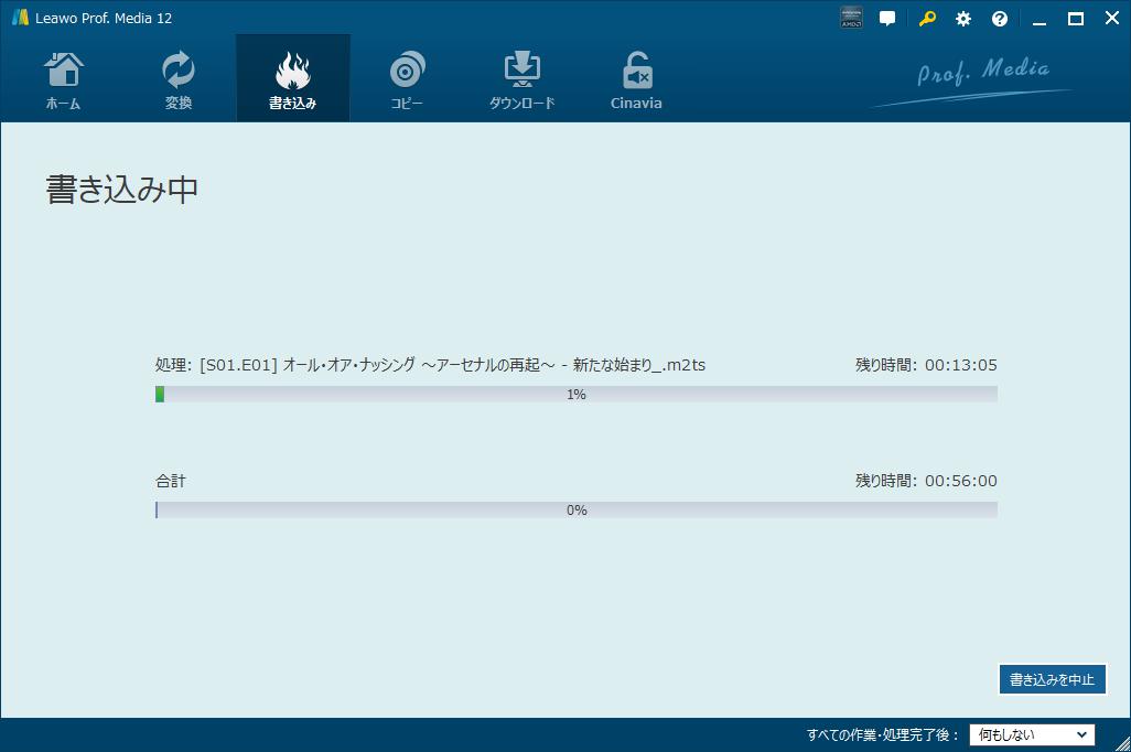 すべての設定が完了した後、サイドバーの下部にある「書き込み」ボタンをクリックすれば、4Kブルーレイの作成プロセスを開始します。その後、「書き込み中」のコピー状態パネルが表示され、進行状況を確認できます。書き込みプロセスはいつでもキャンセル/停止可能で、右下隅で作業完了後の設定も変更できます。